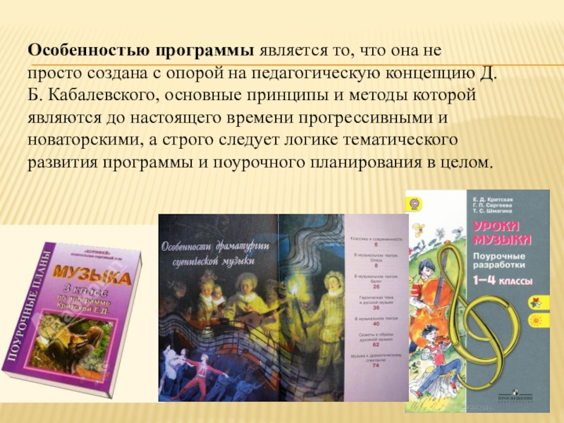 концепцию Д.Б. Кабалевского, основные принципы и методы которой являются до настоящего времени прогрессивными и новаторскими, а строго следует логике тематического развития программы и поурочного планирования в целом.