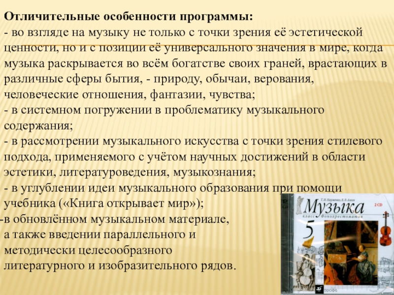 - в углублении идеи музыкального образования при помощи учебника («Книга открывает мир»);