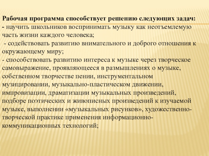 - способствовать развитию интереса к музыке через творческое самовыражение, проявляющееся в размышлениях о музыке, собственном творчестве пении, инструментальном музицировании, музыкально-пластическом движении, импровизации, драматизации музыкальных произведений, подборе поэтических и живописных произведений к изучаемой музыке, выполнении «музыкальных рисунков», художественно-творческой практике применения информационно-коммуникационных технологий;
