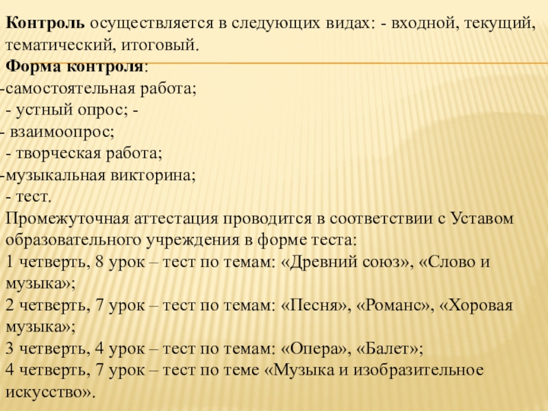 Слайд 12Контроль осуществляется в следующих видах: - входной, текущий, тематический, итоговый.
