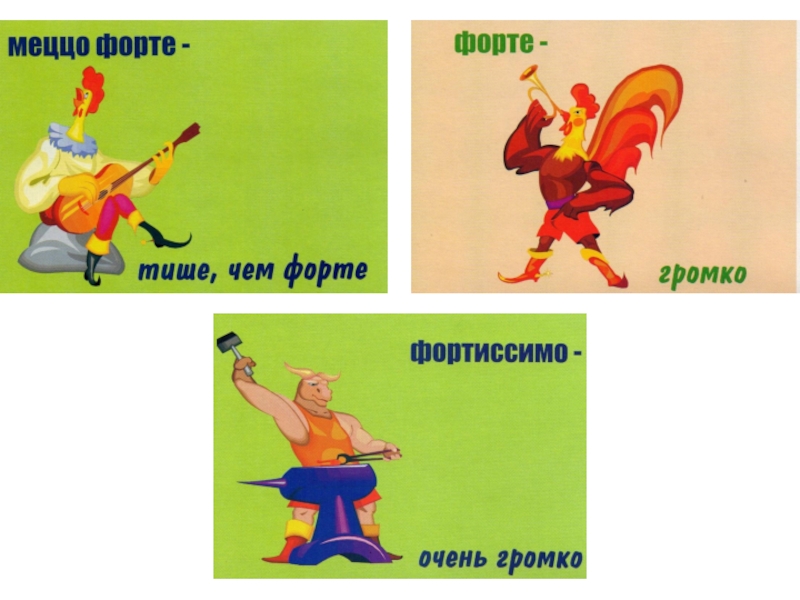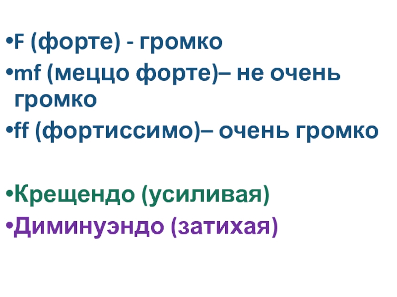 F (форте) - громкоmf (меццо форте)– не очень громкоff (фортиссимо)– очень громкоКрещендо (усиливая) Диминуэндо (затихая)