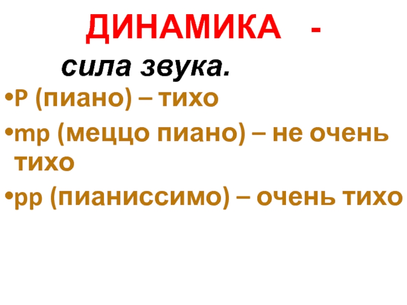 P (пиано) – тихоmp (меццо пиано) – не очень тихо pp (пианиссимо) – очень тихоДИНАМИКА  -сила