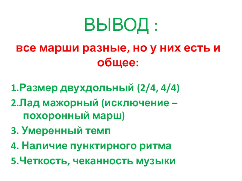 ВЫВОД :все марши разные, но у них есть и общее: 1.Размер двухдольный (2/4, 4/4)2.Лад мажорный (исключение –