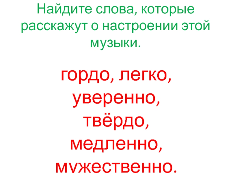 Найдите слова, которые расскажут о настроении этой музыки. гордо, легко, уверенно, твёрдо, медленно, мужественно.
