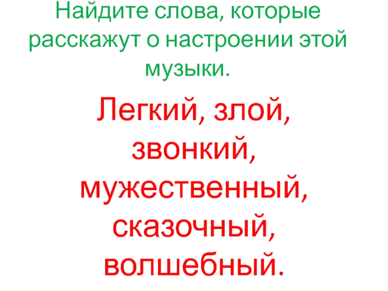 Найдите слова, которые расскажут о настроении этой музыки.  Легкий, злой, звонкий, мужественный, сказочный, волшебный.