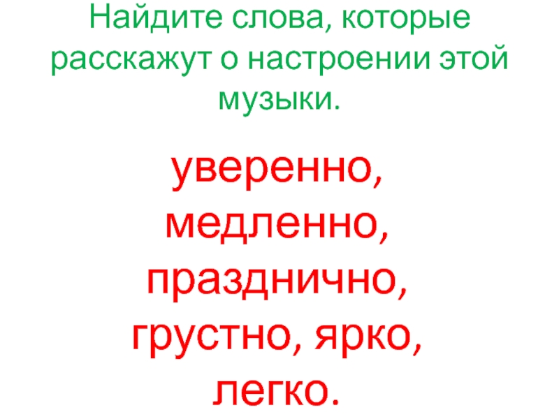 Найдите слова, которые расскажут о настроении этой музыки.уверенно, медленно, празднично, грустно, ярко, легко.
