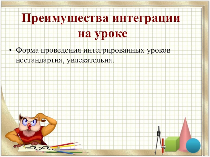 Преимущества интеграции  на урокеФорма проведения интегрированных уроков нестандартна, увлекательна.