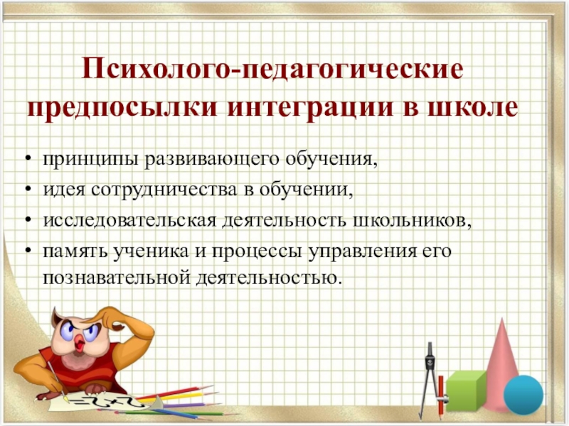 Психолого-педагогические предпосылки интеграции в школепринципы развивающего обучения, идея сотрудничества в обучении, исследовательская деятельность школьников, память ученика и