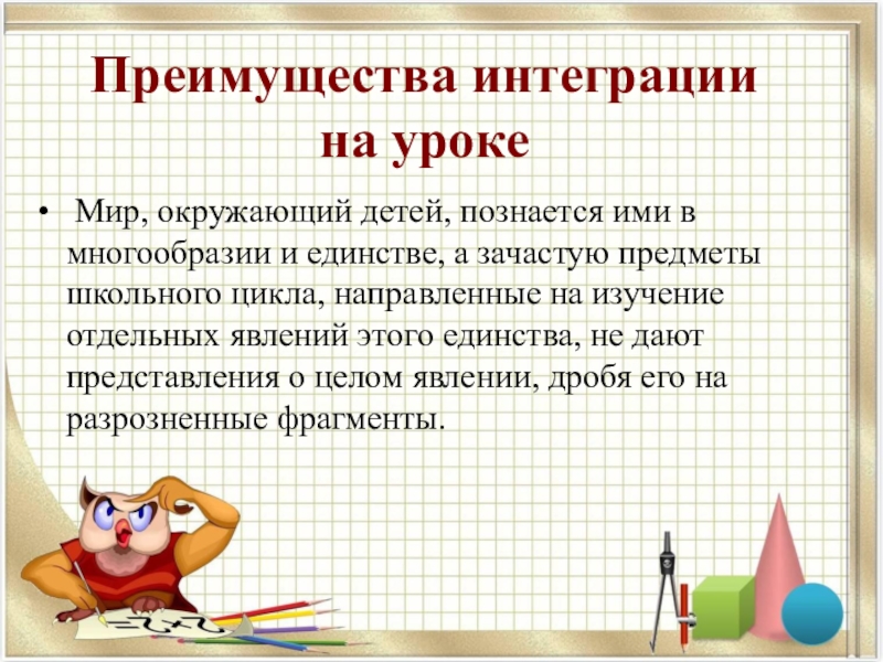 Преимущества интеграции  на уроке Интегрированные уроки развивают потенциал самих учащихся, побуждают к активному познанию окружающей действительности,