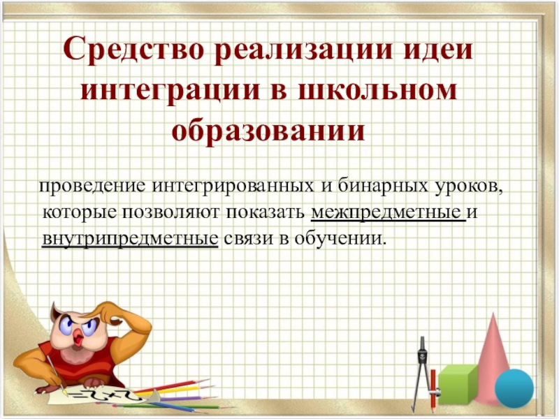 Средство реализации идеи интеграции в школьном образовании  проведение интегрированных и бинарных уроков, которые позволяют показать межпредметные