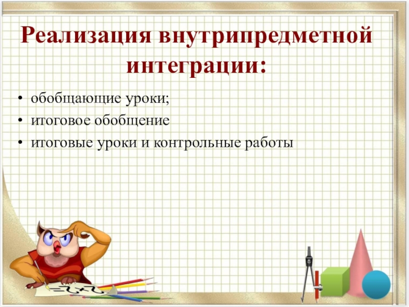Реализация внутрипредметной интеграции: обобщающие уроки;итоговое обобщениеитоговые уроки и контрольные работы