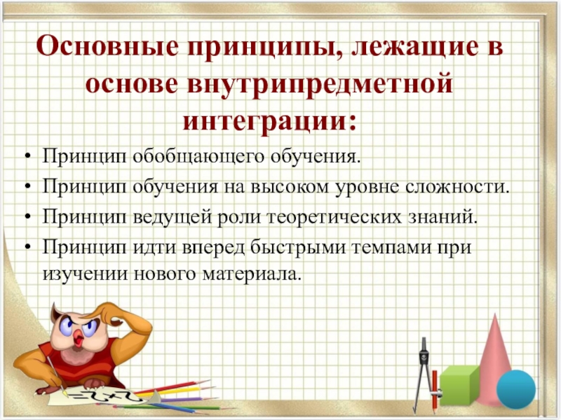 Основные принципы, лежащие в основе внутрипредметной интеграции: Принцип обобщающего обучения.Принцип обучения на высоком уровне сложности.Принцип ведущей роли