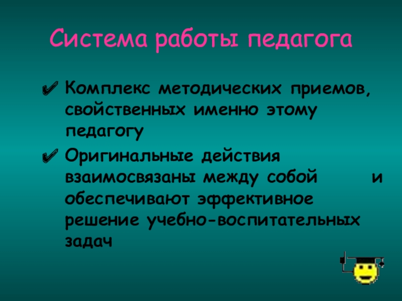 Система работы педагогаКомплекс методических приемов, свойственных именно этому педагогуОригинальные действия взаимосвязаны между собой    и
