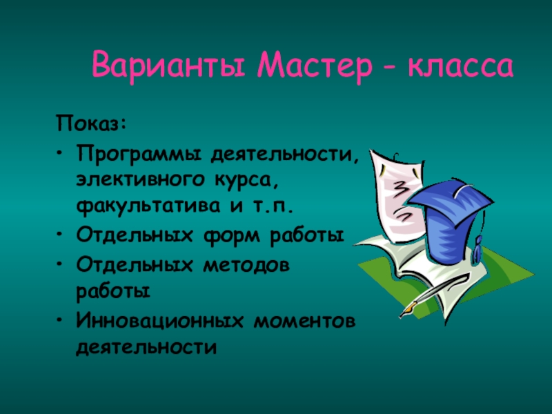 Варианты Мастер - классаПоказ:Программы деятельности, элективного курса, факультатива и т.п.Отдельных форм работыОтдельных методов работыИнновационных моментов деятельности