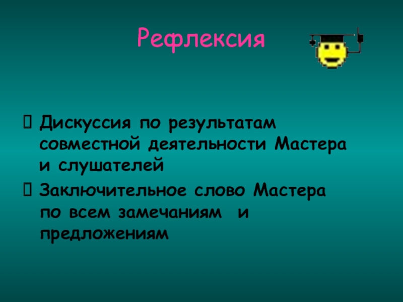 Рефлексия Дискуссия по результатам совместной деятельности Мастера и слушателейЗаключительное слово Мастера по всем замечаниям и предложениям