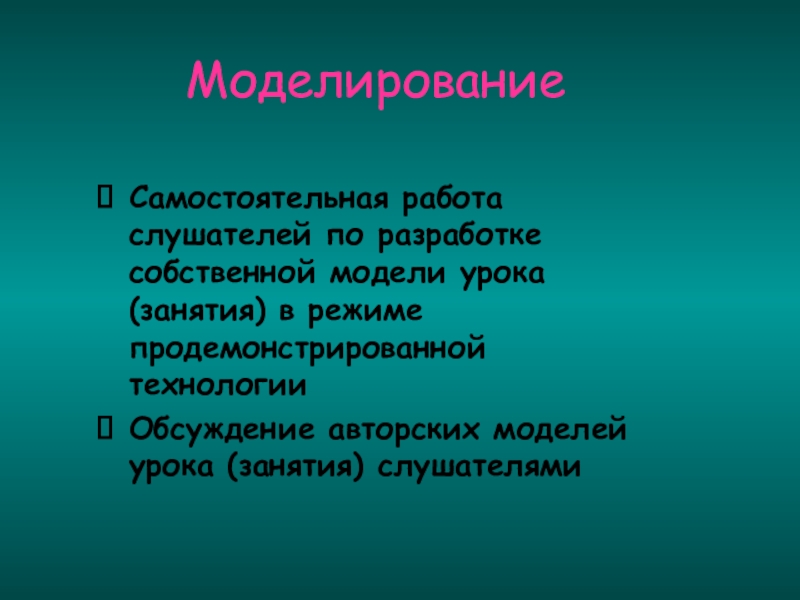 Моделирование Самостоятельная работа слушателей по разработке собственной модели урока (занятия) в режиме продемонстрированной технологииОбсуждение авторских моделей урока