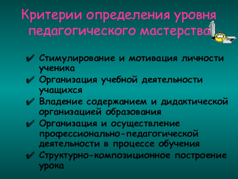 Критерии определения уровня педагогического мастерстваСтимулирование и мотивация личности ученикаОрганизация учебной деятельности учащихсяВладение содержанием и дидактической организацией образованияОрганизация