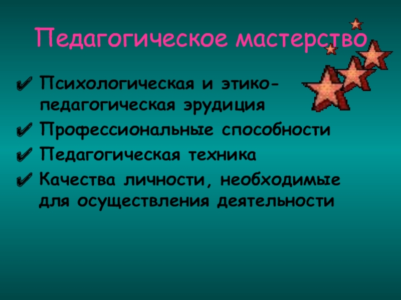 Педагогическое мастерствоПсихологическая и этико-педагогическая эрудицияПрофессиональные способностиПедагогическая техникаКачества личности, необходимые для осуществления деятельности