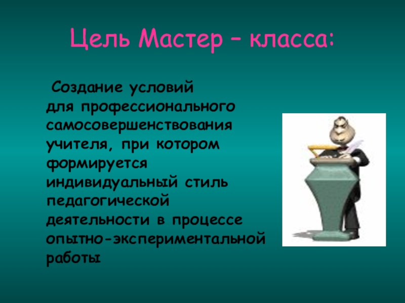 Цель Мастер – класса:	Создание условий     для профессионального самосовершенствования учителя, при котором формируется индивидуальный