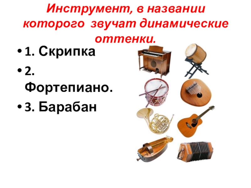Инструмент, в названии которого звучат динамические оттенки.1. Скрипка2. Фортепиано.3. Барабан