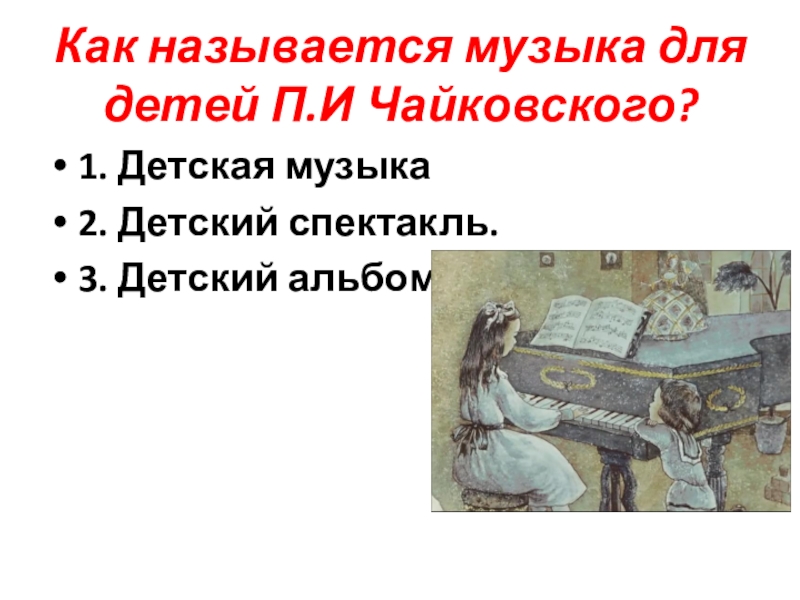 Как называется музыка для детей П.И Чайковского?1. Детская музыка2. Детский спектакль.3. Детский альбом.