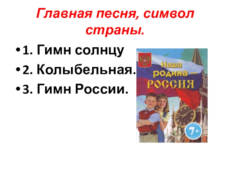 Первая песня в жизни человека.1. Гимн.2. Колыбельная.3. Песня о школе.
