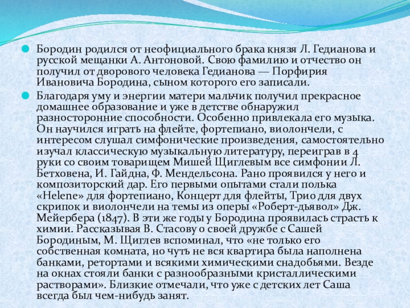 Слайд 4Бородин родился от неофициального брака князя Л. Гедианова и русской мещанки
