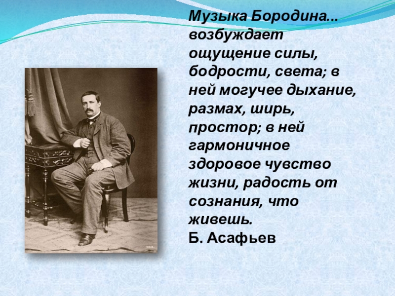 Слайд 1Музыка Бородина... возбуждает ощущение силы, бодрости, света; в ней могучее дыхание,