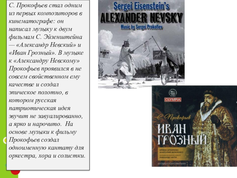музыку к двум фильмам С. Эйзенштейна — «Александр Невский» и «Иван Грозный». В музыке к «Александру Невскому» Прокофьев проявился в не совсем свойственном ему качестве и создал эпическое полотно, в котором русская патриотическая идея звучит не завуалированно, а ярко и нарочито. На основе музыки к фильму Прокофьев создал одноименную кантату для оркестра, хора и солистки.