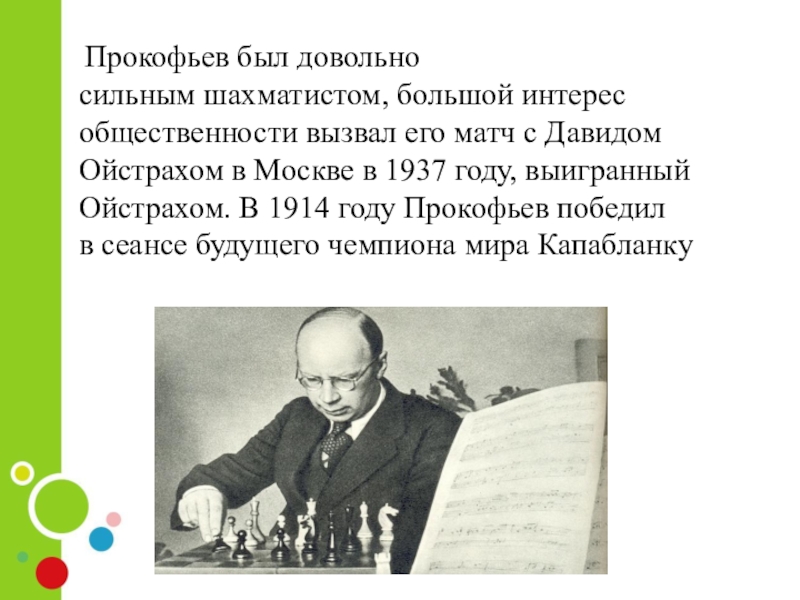 Слайд 12 Прокофьев был довольно сильным шахматистом, большой интерес общественности вызвал его
