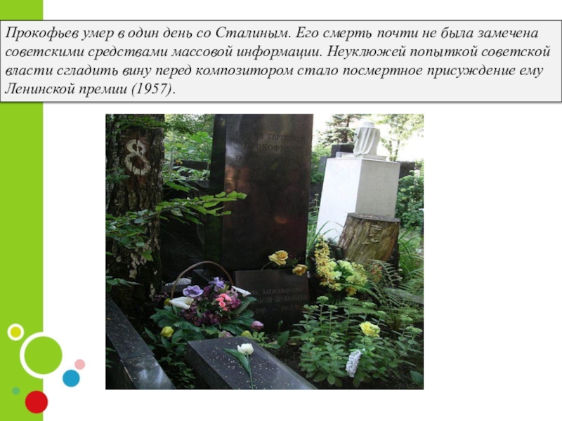 Слайд 11Прокофьев умер в один день со Сталиным. Его смерть почти не