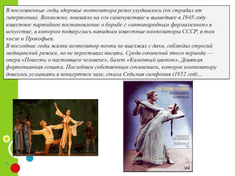 Возможно, повлияло на его самочувствие и вышедшее в 1948 году известное партийное постановление о борьбе с «антинародным формализмом» в искусстве, в котором подверглись нападкам известные композиторы СССР, в том числе и Прокофьев.