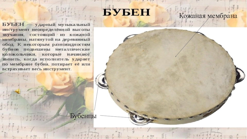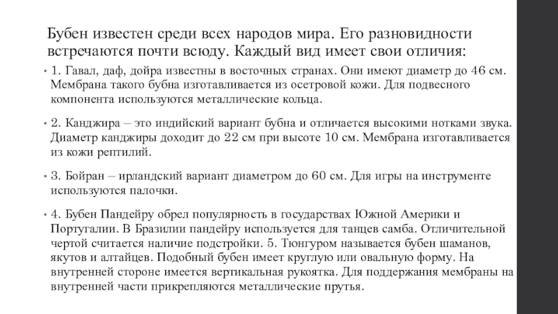 4. Бубен Пандейру обрел популярность в государствах Южной Америки и Португалии. В Бразилии пандейру используется для танцев самба. Отличительной чертой считается наличие подстройки. 5. Тюнгуром называется бубен шаманов, якутов и алтайцев. Подобный бубен имеет круглую или овальную форму. На внутренней стороне имеется вертикальная рукоятка. Для поддержания мембраны на внутренней части прикрепляются металлические прутья.