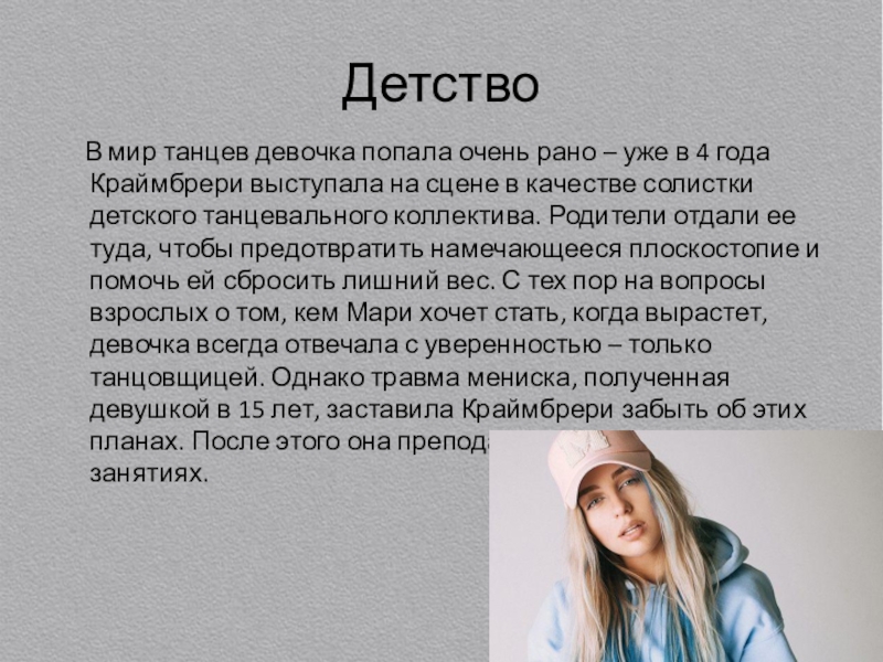 – уже в 4 года Краймбрери выступала на сцене в качестве солистки детского танцевального коллектива. Родители отдали ее туда, чтобы предотвратить намечающееся плоскостопие и помочь ей сбросить лишний вес. С тех пор на вопросы взрослых о том, кем Мари хочет стать, когда вырастет, девочка всегда отвечала с уверенностью – только танцовщицей. Однако травма мениска, полученная девушкой в 15 лет, заставила Краймбрери забыть об этих планах. После этого она преподавала танцы на групповых занятиях.