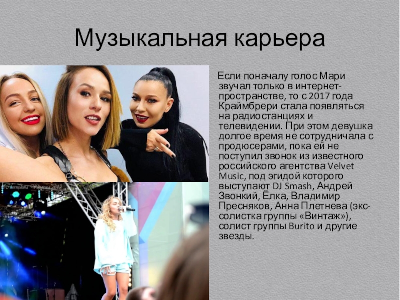 интернет-пространстве, то с 2017 года Краймбрери стала появляться на радиостанциях и телевидении. При этом девушка долгое время не сотрудничала с продюсерами, пока ей не поступил звонок из известного российского агентства Velvet Music, под эгидой которого выступают DJ Smash, Андрей Звонкий, Ёлка, Владимир Пресняков, Анна Плетнева (экс-солистка группы «Винтаж»), солист группы Burito и другие звезды.