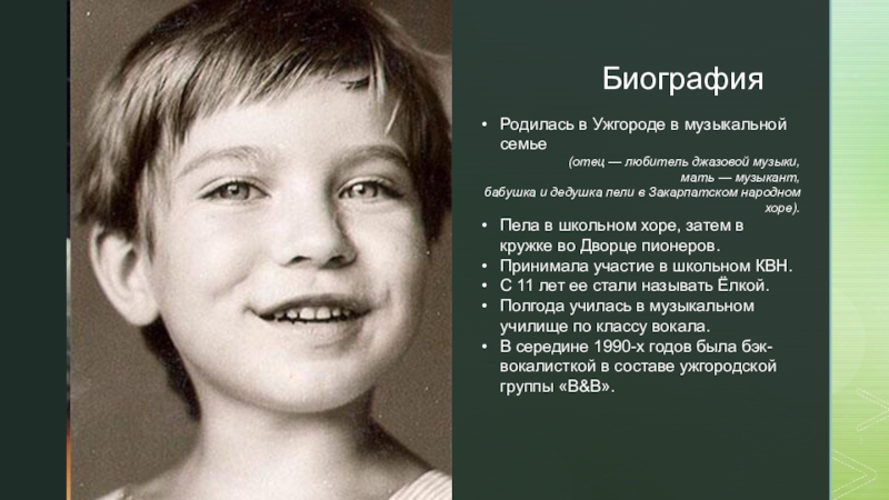 БиографияРодилась в Ужгороде в музыкальной семье (отец — любитель джазовой музыки, мать — музыкант,
