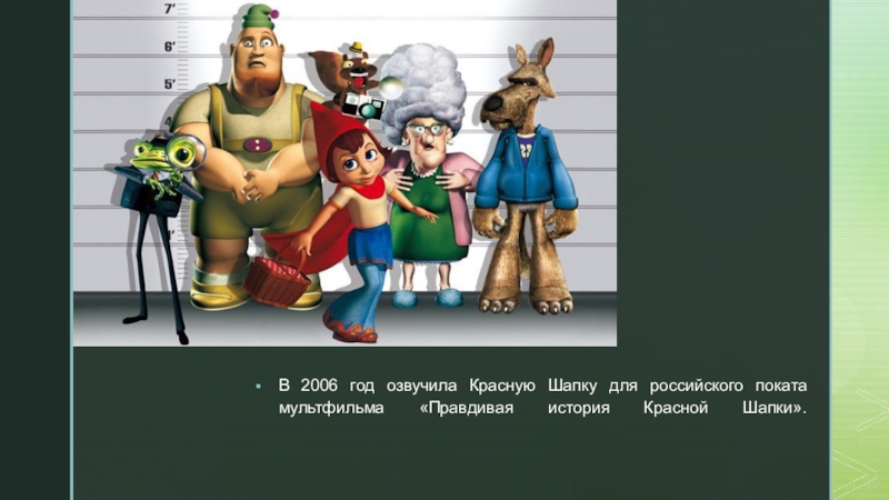 Слайд 4В 2006 год озвучила Красную Шапку для российского поката мультфильма «Правдивая