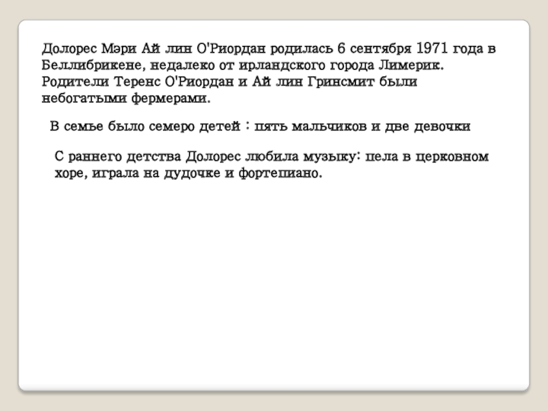 С раннего детства Долорес любила музыку: пела в церковном хоре, играла на дудочке и фортепиано.