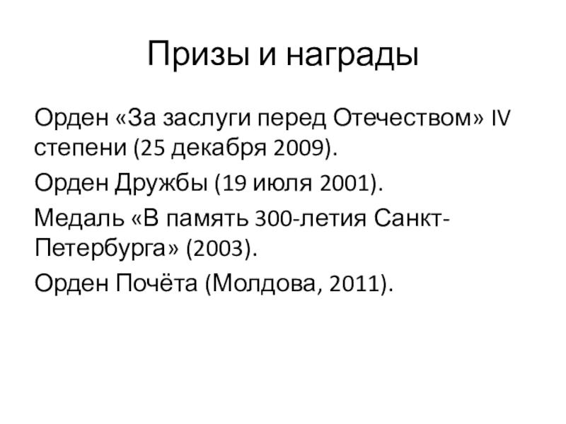 Призы и награды Орден «За заслуги перед Отечеством» IV степени (25 декабря 2009).Орден Дружбы (19 июля 2001).Медаль