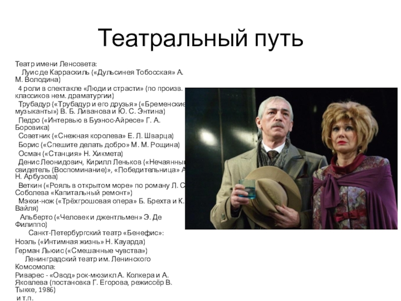 Театральный путьТеатр имени Ленсовета:  Луис де Карраскиль («Дульсинея Тобосская» А. М. Володина) 4 роли в спектакле