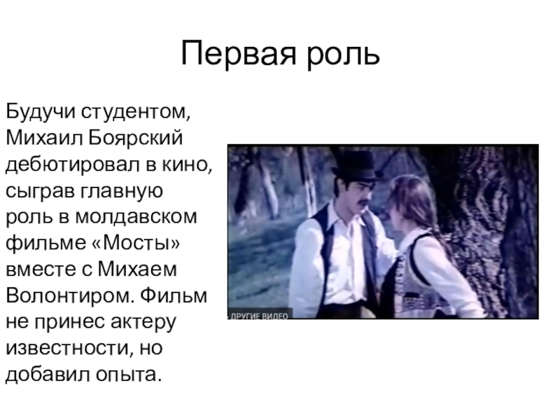 Первая роль Будучи студентом, Михаил Боярский дебютировал в кино, сыграв главную роль в молдавском фильме «Мосты» вместе
