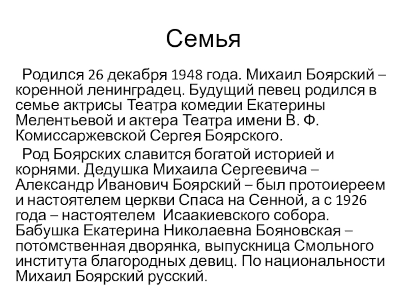 Семья Родился 26 декабря 1948 года. Михаил Боярский – коренной ленинградец. Будущий певец родился в семье актрисы
