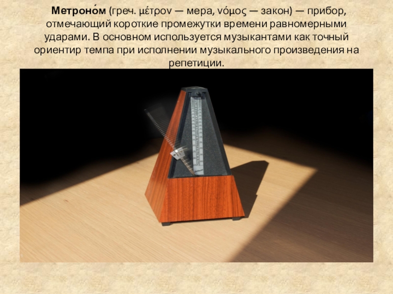 Слайд 7 Метроно́м (греч. μέτρον — мера, νόμος — закон) — прибор, отмечающий короткие промежутки времени равномерными ударами.