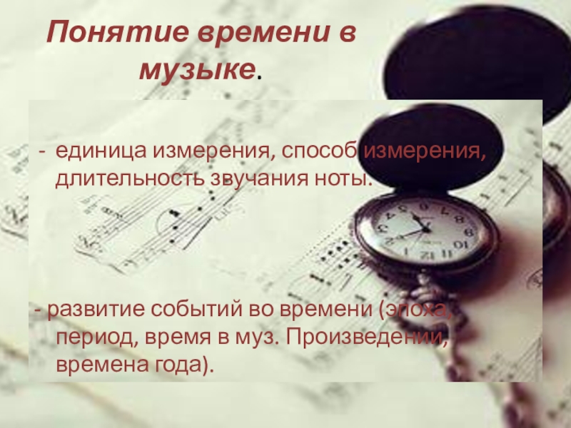 Понятие времени в музыке.единица измерения, способ измерения, длительность звучания ноты.- развитие событий во времени (эпоха, период, время