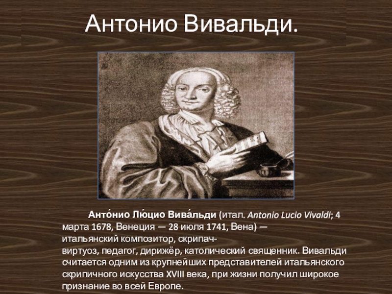Анто́нио Лю́цио Вива́льди (итал. Antonio Lucio Vivaldi; 4 марта 1678, Венеция — 28 июля 1741, Вена) —итальянский композитор, скрипач-виртуоз, педагог, дирижёр, католический священник. Вивальди считается одним из крупнейших представителей итальянского скрипичного искусства XVIII века, при жизни получил широкое