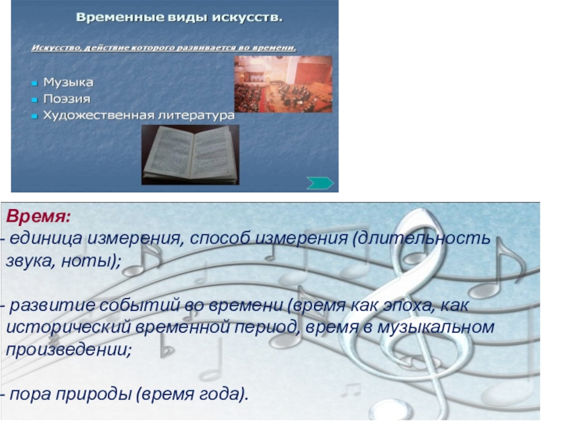 Время: единица измерения, способ измерения (длительность звука, ноты); развитие событий во времени (время как эпоха, как исторический