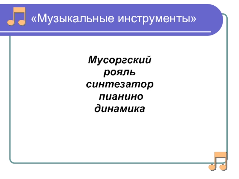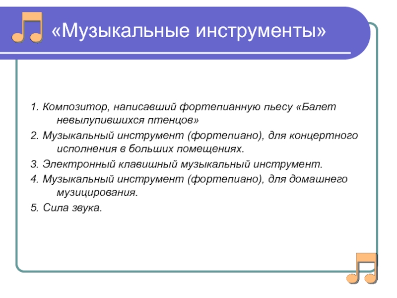 «Музыкальные инструменты»1. Композитор, написавший фортепианную пьесу «Балет невылупившихся птенцов»2. Музыкальный инструмент (фортепиано), для