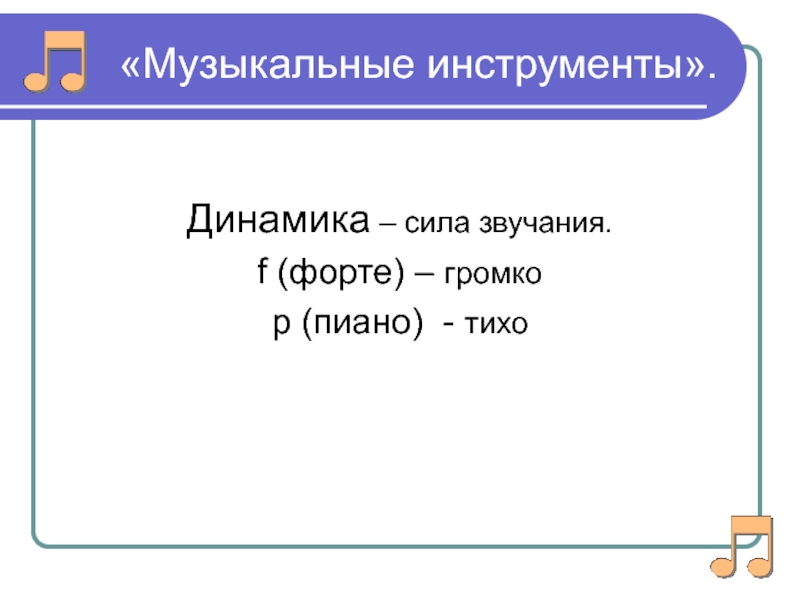 «Музыкальные инструменты».Динамика – сила звучания.f (форте) – громкор (пиано) - тихо