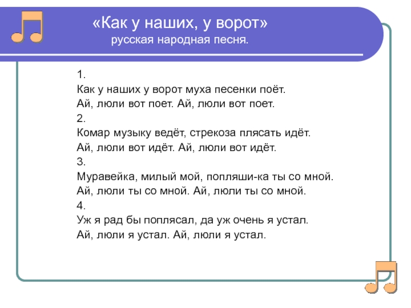 «Как у наших, у ворот» русская народная песня.1.Как у наших у ворот муха песенки поёт.Ай, люли вот поет. Ай, люли вот поет.2.Комар музыку ведёт, стрекоза плясать идёт.Ай, люли вот идёт. Ай, люли вот идёт.3.Муравейка, милый мой,