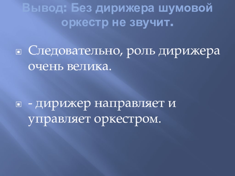 Слайд 31Вывод: Без дирижера шумовой оркестр не звучит.